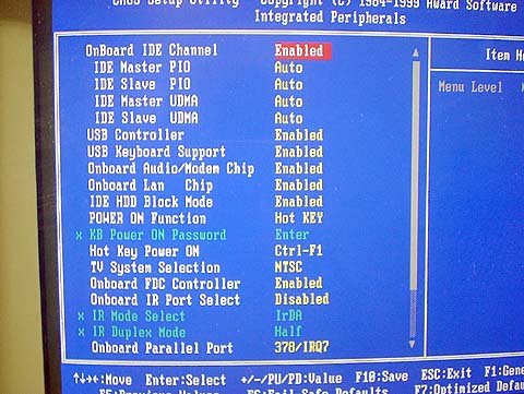 方に隠れている部分も設定しましょう. なお,デフォルト状態ではIDEのUDMAの設定が,Disableになっている場合があり ます.これをAutoにしておかないとディスクのパフォーマンスが出ませんので,一 度確認してみてください.また,オンボードのLAN機能が動作しない場合などは, ここでDisabledになっている場合もあります. プリンタの動作モードは,ECP+EPPにする方が良いかもしれませんが,これは好 みということで. IR(赤外線通信)機能はここを見ると使えそうですが,ハー ド的に存在しないので,使用できません.M/Bにはいくつかの使用していないパターン がそんざいしているので,これを接続すれば,使用できるようになるかもしれません. |